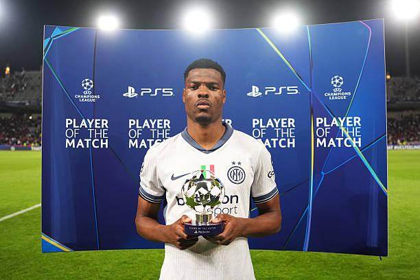 欧足联官方将2球1助的邓弗里斯评为当场最佳球员。